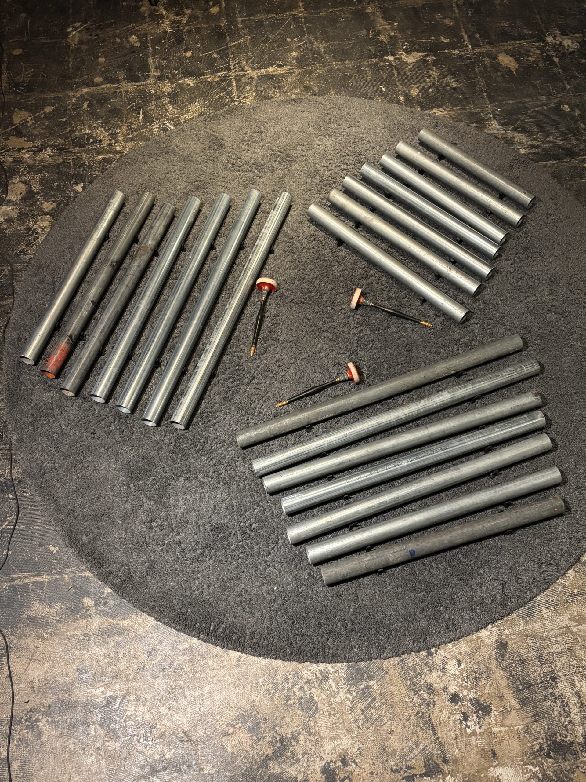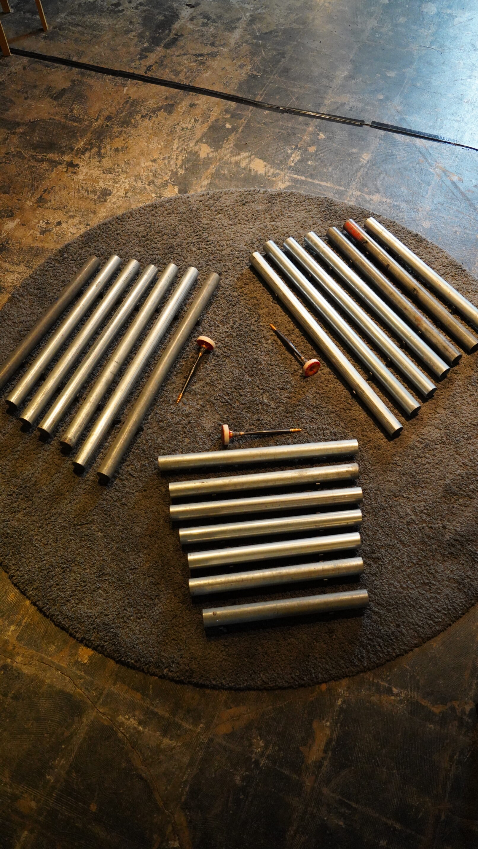 When I taught music at an Antibodies Collective workshop at Seibu Kodo, this work began as a workshop prompt: we found a large stockpile of scaffolding pipes in the backstage yard and used them to improvise a gamelan ensemble on the spot. Worn from years of use and roughly cut, each pipe carried an exquisitely microtonal resonance, and the raw sound of six people playing together filled the hall.