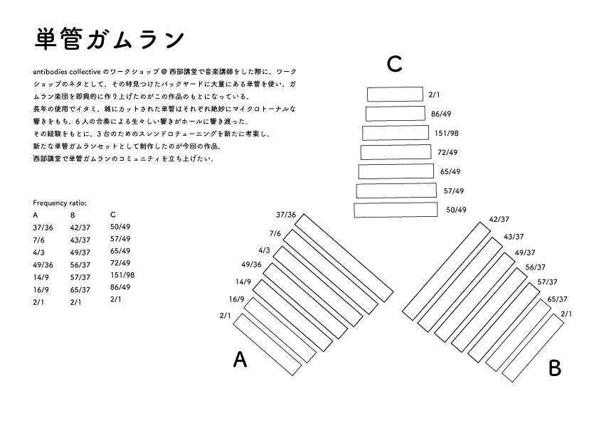 antibodies collectiveのワークショップ@西部講堂で音楽講師をした際に、ワークショップのネタとして、その時見つけたバックヤードに大量にある単管を使い、ガムラン楽団を即興的に作り上げたのがこの作品のもとになっている。 長年の使用でイタミ、雑にカットされた単管はそれぞれ絶妙にマイクロトーナルな響きをもち、6人の合奏による生々しい響きがホールに響き渡った。 その経験をもとに、3台のためのスレンドロチューニングを新たに考案し、 新たな単管ガムランセットとして制作したのが今回の作品。
